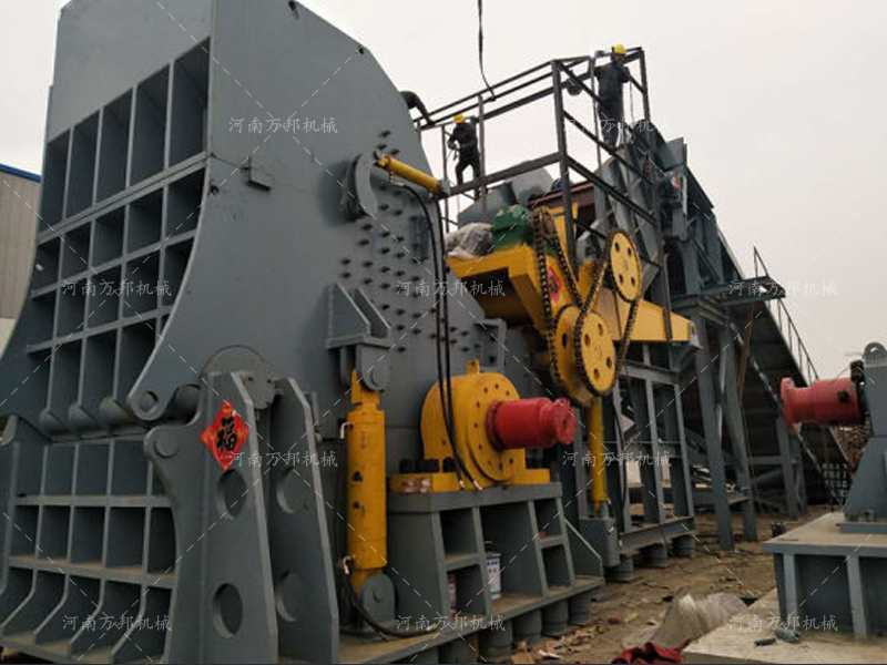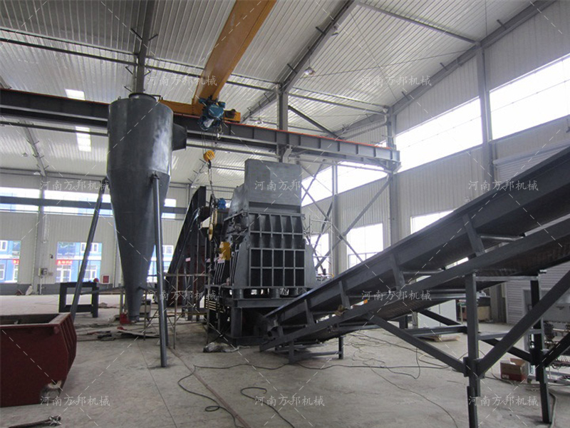 在金屬揉球機(jī)原理上物料通過(guò)上料輸送裝置廢鋼破碎機(jī)送料滑板物料通過(guò)強(qiáng)制壓料輥和擠壓輥將廢鐵中易燃易爆物料進(jìn)行一次壓損防止物料產(chǎn)生爆炸,經(jīng)過(guò)一次壓損后的物料在二次壓料板的擠壓下被強(qiáng)制送入破碎機(jī)腔內(nèi),設(shè)備主軸在高速大扭矩電機(jī)的驅(qū)動(dòng)下,主機(jī)轉(zhuǎn)子上的錘頭輪流擊打進(jìn)入主機(jī)腔內(nèi)的金屬?gòu)U料進(jìn)行擊打、揉搓、撕裂加工將廢鐵中依附的雜質(zhì)、油漆、油污進(jìn)行清除最終將廢鋼一次性加工成球狀團(tuán)粒經(jīng)過(guò)設(shè)備底部篩網(wǎng)卸除完成破碎過(guò)程,經(jīng)過(guò)破碎后的物料經(jīng)設(shè)備底部震動(dòng)給料機(jī)均勻的送入出料皮帶輸送機(jī)經(jīng)過(guò)磁力分選后將廢鋼中的雜質(zhì)與鋼鐵進(jìn)行分離從而完成整個(gè)破碎作業(yè),該設(shè)備除了配備以上設(shè)施外還配備有隔音房、除塵系統(tǒng),在設(shè)備結(jié)構(gòu)上可見(jiàn)下圖: